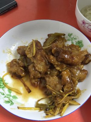 锅内留油、就像用纸擦过一样就行、放入白糖、加水、熬至水发红、冒泡泡、放肉片、加醋、翻炒均匀、加胡萝卜丝葱丝、装盘出锅喽!
