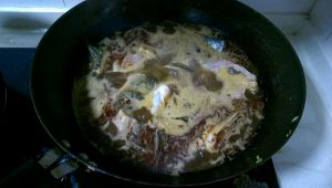 加入足量的开水,鱼煎好了是奶白的汤,煮开后(中火共煮二十分钟)煮的过程中根据汤量加盐,我这里加了6小勺,汤稍微咸点菜和肉吃起来比较有味道