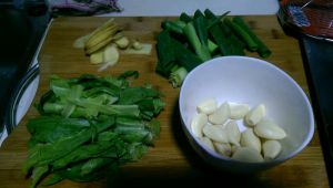 准备好葱姜蒜、青笋,葱切段,姜切片,蒜切片,青笋切成丝儿,准备就绪。