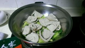 菜先煮会 不要煮太久,放入一个大的容器中 鱼头鱼骨煮好后捞出铺在上面,汤还是留在锅中