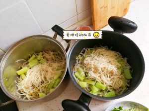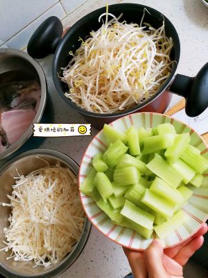 腌制鱼片的同时,把黄豆芽等配菜洗干净,并把芹菜,蒜苗切成4.5厘米长的段,莴笋尖切成6.5厘米长的薄片,