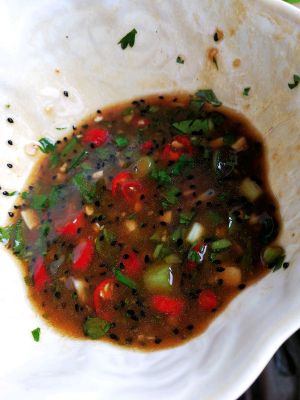 这次调了酱汁,蘸着吃超级香 香菜 蒜末 蚝油 芝麻 六月鲜 醋 生抽 小葱 香油 小米辣 最后倒入烧好的花椒油,超级好吃