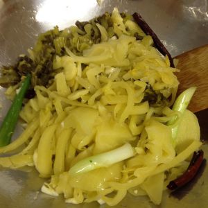 另起一锅,放少许油烧热,大火下葱姜蒜爆香后,加入泡椒段和酸菜段继续翻炒2-3分钟