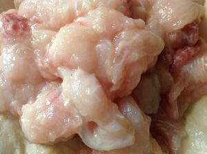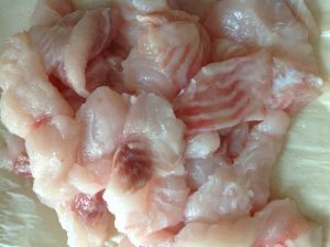 将鱼肉改斜刀切成大片,加精盐、味精、粉、蛋清抓匀上浆,淋上湿淀粉,待用