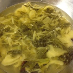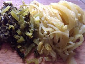 将四川酸菜改刀切片,用水泡一下,然后再冲洗一下,以免太咸