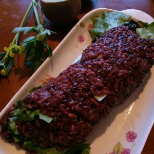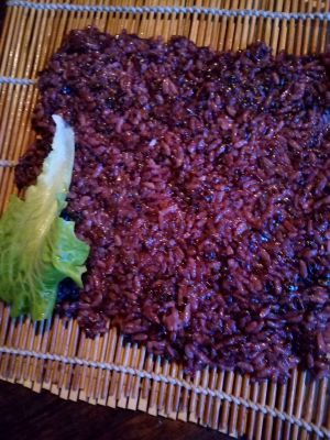 最后卷的时候动作稍微慢点轻压,可能有少许饭粒沾在竹帘上,成形后在用手稍微整形,一个漂亮的紫米卷诞生啦