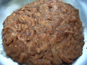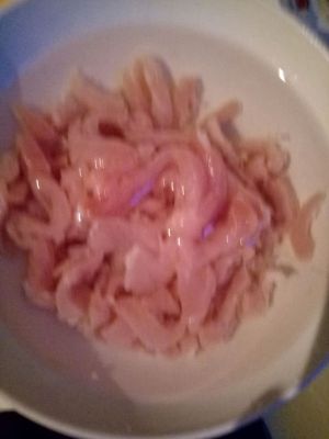 这是鸡胸肉切好腌制的图。你能看得出来是鸡肉吗? 腌制方法很简单。鸡胸肉切丝后。加水 生粉 老抽 生抽 耗油 盐 然后均匀的用手搅拌 不停的用手按摩 最后香油 腌制时间越长越好。 这样肉才会非常的嫩。