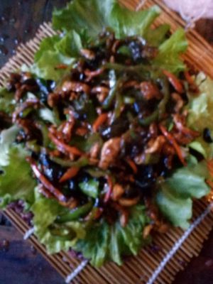 开火,待锅热,锅里倒少量油,放入肉炒到变色,然后放入葱姜翻炒出香味,放入木耳翻炒几下,再放入青椒,翻炒几次,加入适量盐,鸡精。略翻炒几下。关火。成盘! 大功告成!