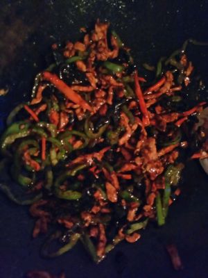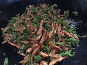 锅内底油 放入蒜末姜末和食材(青椒和肉丝)盐少于 味精 鸡精 胡椒 耗油 生抽 香油 大火翻炒出锅