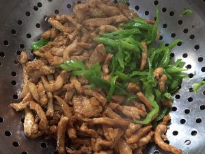 倒入腌制好的肉丝,快速翻炒1分钟 注意:肉丝不要炒太久不然会变老
