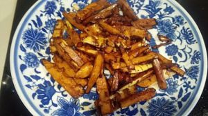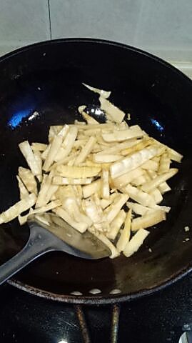 春笋扒好,用刀将春笋拍扁,切成5CM长的条,锅上烧多些油,放入春笋大火炒大概两三分钟。