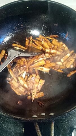 锅内加生抽、老抽、糖翻炒入味。