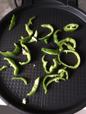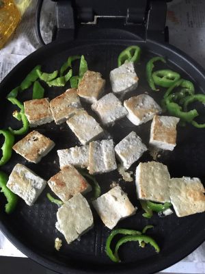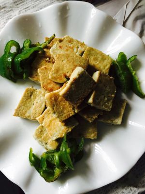 2分钟左右,臭豆腐表面微黄后撒两小勺盐翻炒一会儿,加入辣椒再炒1分钟后,倒一点点水
