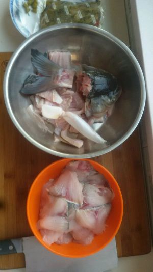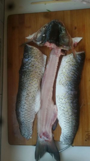 草鱼去麟清理干净,如图片开! 鱼骨切段,鱼肉皮朝下斜刀片大片,