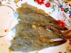 鲜虾500克剥皮, 从背部破开成片,轻轻拍平,用精盐 胡椒粉腌入味。