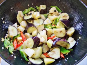 下入炸好的土豆块,茄子块和青辣椒翻炒几下