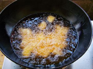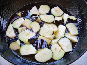 把茄子块入五六成热的油锅中炸制微黄捞出控油,待油温降至五六成热时再下入土豆块