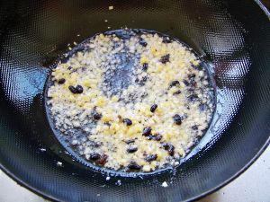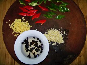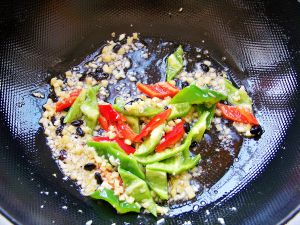 豆豉泡发,杭椒切菱形块,姜蒜切米
