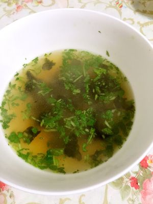 4取一只碗,放入海苔,香菜末,和少许盐,把事先熬好的骨头汤加热,倒入碗中