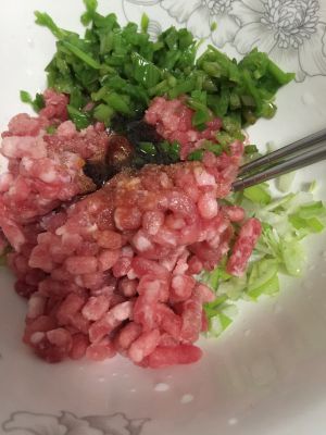1.将水芹抄水后,和肉馅及其他调味料一起搅拌