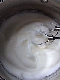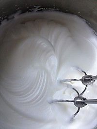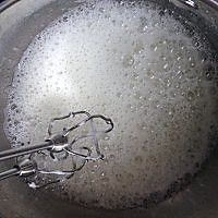 蛋清用打蛋器一档打出大鱼眼状,分三次加入糖,打到九分发即可。