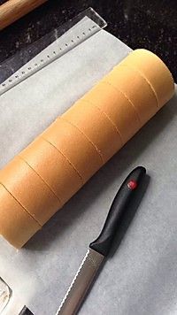待温热后重新拿张油纸盖上,同时拿起两张油纸一侧翻过来,切除上下两边(此步骤忘记拍图了,下次补上)我是借助擀面杖,开头先压一压,这个卷起没有空心,比较饱满