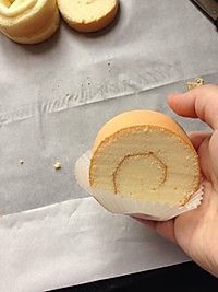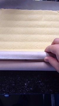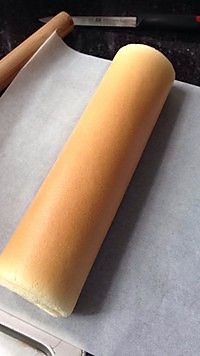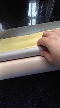 待有余温时拿张油纸盖住翻过来,借助擀面杖把蛋糕卷起来,卷好用油纸包住定型3分钟