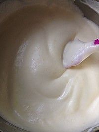 把打好的蛋清放入蛋黄糊中搅拌均匀,切记不要混圈,十字花上下搅拌,