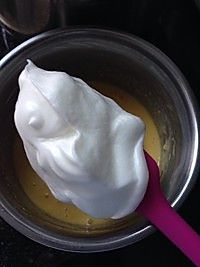 三分之一或四分之一蛋白都无所谓,加入蛋黄液一起搅拌均匀,刮刀炒菜的手法 倒入剩下蛋白一起搅拌均匀