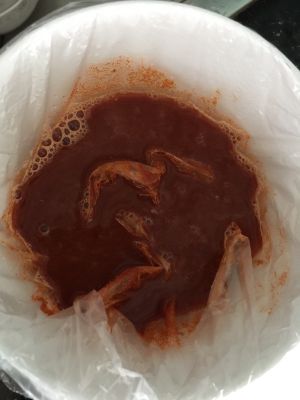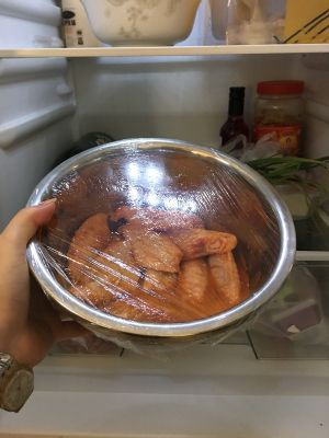 把鸡翅浸泡在调料中,用保鲜膜包好放置冰箱8~12小时(这样鸡翅才够入味)