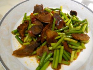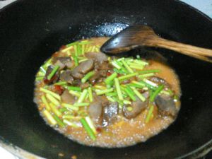 放入蒜苔一起炒,为防止粘锅可以加点水。因为分量少,豆瓣酱是咸的,所以不必再放盐了。