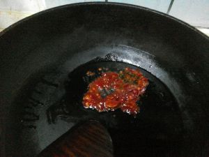 腊肉捞出,另起锅放油,再放郫县豆瓣酱小火煸炒出香味