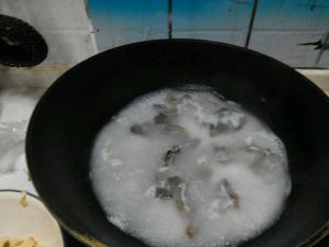 锅中烧水将腊肉焯水,多煮几分钟直到水变成乳白色,这是将腊肉中的亚硝酸盐煮出来