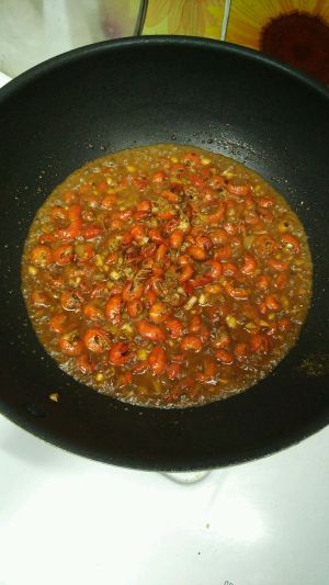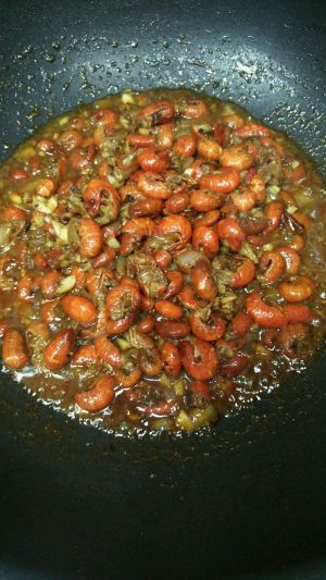 倒入虾球。加糖可以多点提鲜,孜然烧烤料,白胡椒,我加了郫县豆瓣而且虾球用生抽腌过就没有额外再加盐。加开水煮下味道入味。
