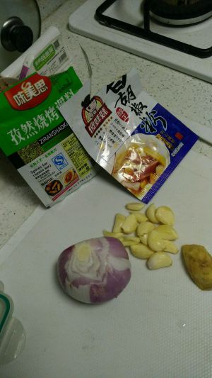 洋葱,大量蒜,姜,孜然料和白胡椒,郫县豆瓣忘记拍了。今天因为老妈不太吃辣没有用辣椒。喜欢辣味的再准备辣椒面,花椒,麻椒