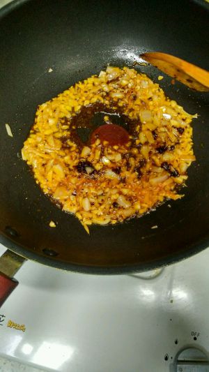 热锅倒油。温度七成把葱姜蒜放进去炒,加郫县豆瓣,准备辣椒的要先放花椒麻椒出味后加葱姜蒜,豆瓣。