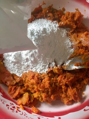 碾碎待其冷却,切不可南瓜很烫的时候就放入糯米粉,不然糯米粉会被烫熟,煎炸后就不松软了!