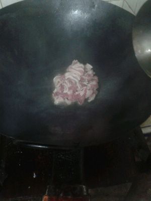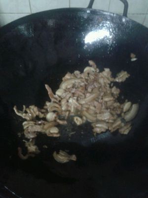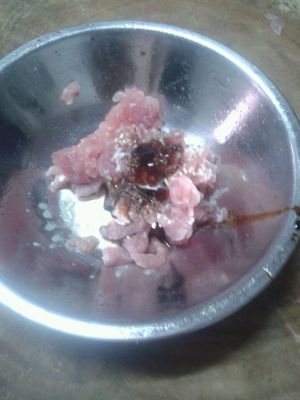 这个时候把腌制好的瘦肉放进随便炒几下。腌制的时候放酱油耗油。