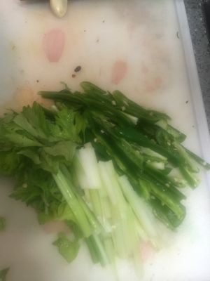 青椒芹菜切段。待肉两面微焦时,倒入锅内,大火炒一炒。