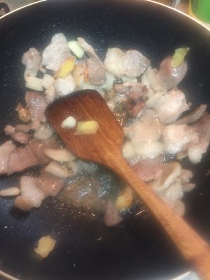 起锅放少量油,放入姜蒜爆香,再放入切好的五花肉翻炒10秒。