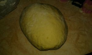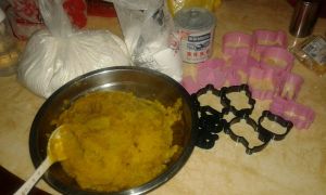 南瓜蒸熟,用果汁机打碎(用机打比较滑)加白糖面粉搅拌成团。