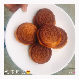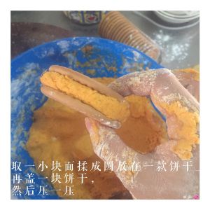 取一点面团揉成圆放在一块饼干上,再盖上一块饼干,压一压