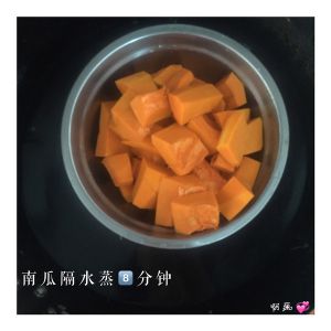 南瓜清洗干净,切片,隔水蒸熟至南瓜变软