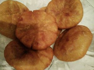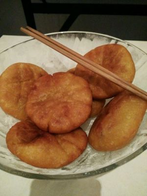 最后就是炸了,这个东西不能急,把锅里多放点油,下锅之前最后是把做好的南瓜饼裹上一层面粉,以防下锅后粘在一起,一次不能炸太多,直到南瓜饼成金黄色并且开始有点微微鼓起,那就可以捞起开吃了!谢谢大家捧场!!!