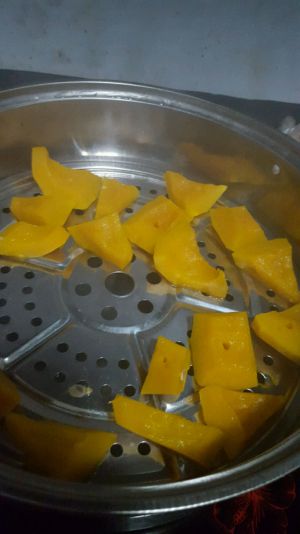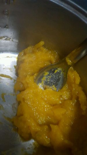 首先将南瓜蒸熟然后找个大汤匙把他们碾成蓉