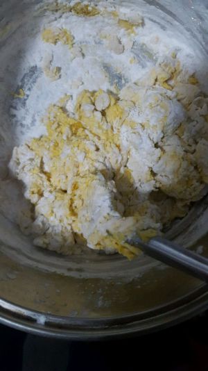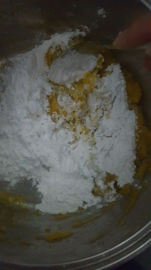 糯米粉和面粉混合均匀倒入热的南瓜泥,要一点一点加,南瓜水分不一样要加的粉量也不一样,数据供参考,和成光滑的面团