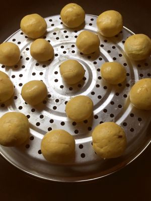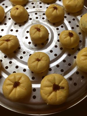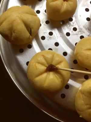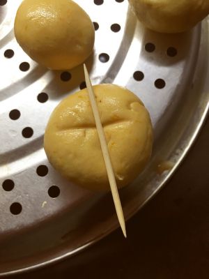 豆沙馅是我自己做的,但是做的不好吃我就不写了,用勺子压出形状,上面放枸杞