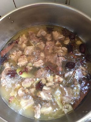 a、牛肉切块放入开水中烫一下,然后用冷水冲掉泡沫,忘记拍照,就一起写吧!b、去沫的牛肉放入冷水中加料酒,姜片,八角,桂皮,香叶,花椒等大料一起煮开,调小火,煲30分钟(有高压锅直接用高压锅压15分钟即可,本人单身,没有那么多家当,就用慢方法)