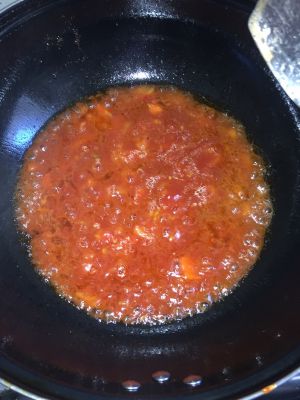 备好的番茄丁下油锅炒出汁,再加适量番茄酱一起炒