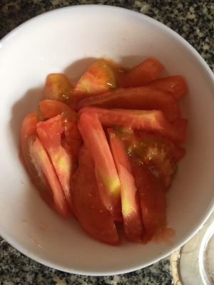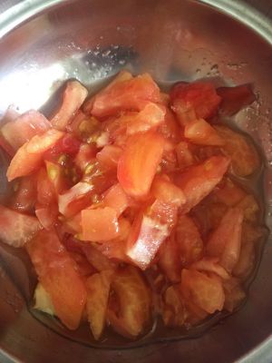 西红柿顶部画十字放入开水中烫一下(不用太久)去皮,切块备用